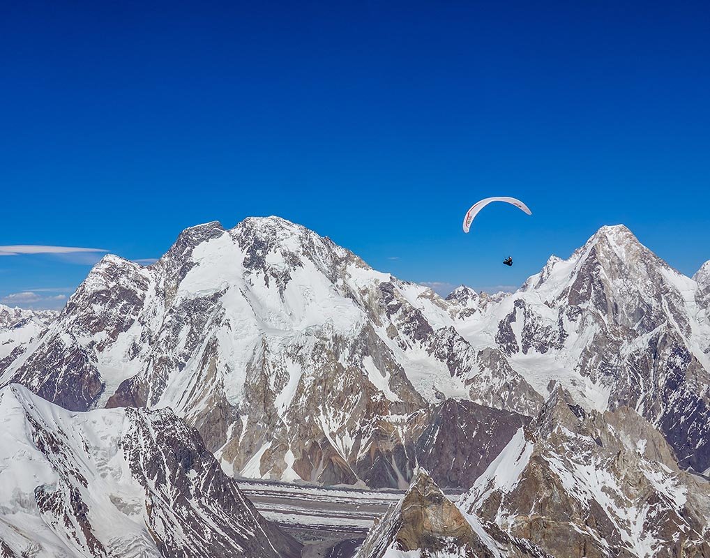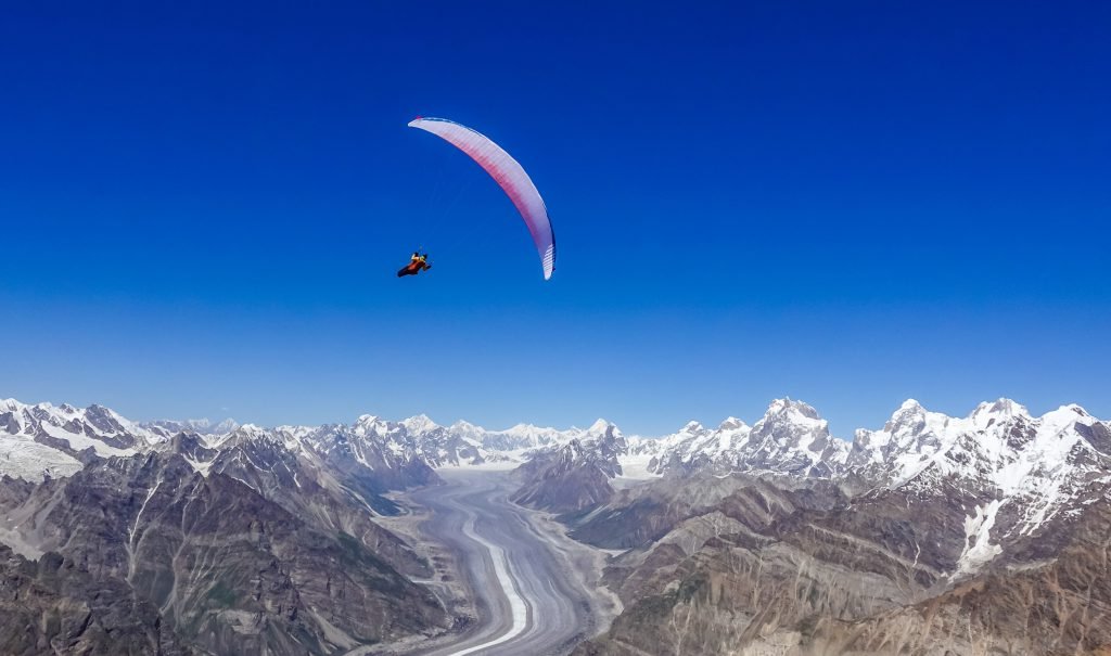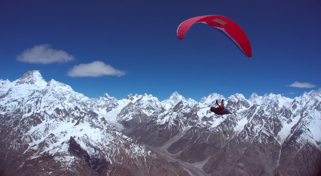 Pakistan has breathtaking flying sites in the North of Hunza, Skardu, Snowlake, Baltoro Glacier, Hushe Valley and the Deosai plateau, among many other mountain sides in Pakistan. The extensive mountain ranges of Karakoram, Himalayas and Hindukush provide excellent opportunities for free flying. For experienced pilots who wish to fly from these amazing sites Alpine Adventure Guides can manage complete logistics for the flying expeditions. The long journey will be from Islamabad to the deep in the Karakorum Mountains. Paragliding is the simplest and most pure form of aviation and easiest way to fulfill mankind’s oldest dream. A foot-launched para glider is easy to transport, launch and land: you launch yourself off a gentle slope facing the wind. Just the inflatable wing comes above you, it starts lifting: a few steps and you are airborne and host customized paragliding events also. Throughout the times of man’s flying skills, there has always been a longing desire that the experience of flight should include a measure of personal freedom and independence. After all, we speak of being as free as a bird, not as an airliner. Easily packed and quickly rigged a contrivance which won’t bend or break if one happens to land a bit hard. All these requirements add up to a perfect description of the Paraglider. A Paraglide is very light in weight, being packed in a medium sized rucksack, is inherently stable and relatively inexpensive.